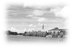 Lahden Salpausselän kisoissa kolmen mäkimontun ylitys lumisella vaijerilla noin 20m korkeudessa.)