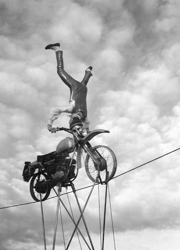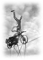 Tirehtööri ajaa yksipyöräisellä maassa ja heiluvalla nuoralla ja joutuupa vielä kiipeämään hurjia viikateportaita.