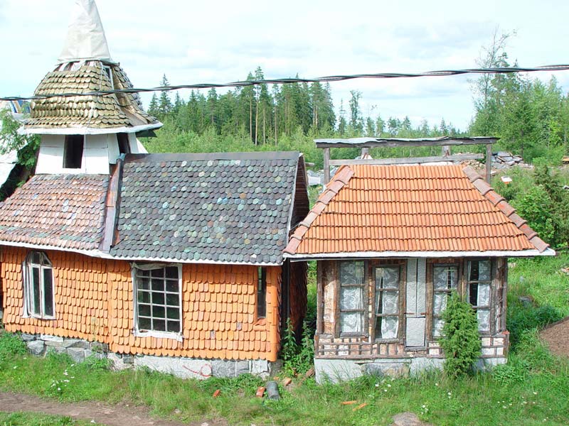 - Rakennukset on tehty ekologisista luonnonmateriaaleista, kierrätysosista ja romuista. Hääkirkon katto on kävynsuomun muotoisista kuparipaanuista, teatterin seinissä on vanhoja hetekoita...